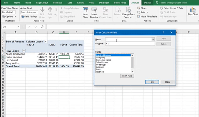 To create a Calculated Item, select a row item and then go to the Analyse tab. On the ribbon click on Fields, Items, & Sets and then choose Calculated Item.